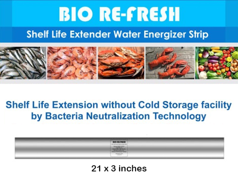 This Technology based Strip is a Researched & Invented Frequencies Embedded Strip at Molecular level using our Proprietary Frequencies Embedding Technology and is meant to help EXTENDING the Shelf Life of PERISHABLES like Sea Food, Vegetables etc., by Neutralizing the effects of decay inducing Spoiler Bacteria, USING WATER ONLY. NO ICE OR COLD STORAGE / REFREGIRATION IS REQUIRED. After the water is treated with Bio Refresh Strip, DIP and RINSE the Seafood Stuff / Vegetables in this water for about 5 seconds to trigger the Shelf Life Extension process. Now, the Seafood Stuff / Vegetables can be kept in OPEN for a minimum of 24 hours and it will still remain FRESH and in a CONSUMABLE / SALEABLE condition. It may sound impossible but It is possible with our Technology and it is happening on the ground.